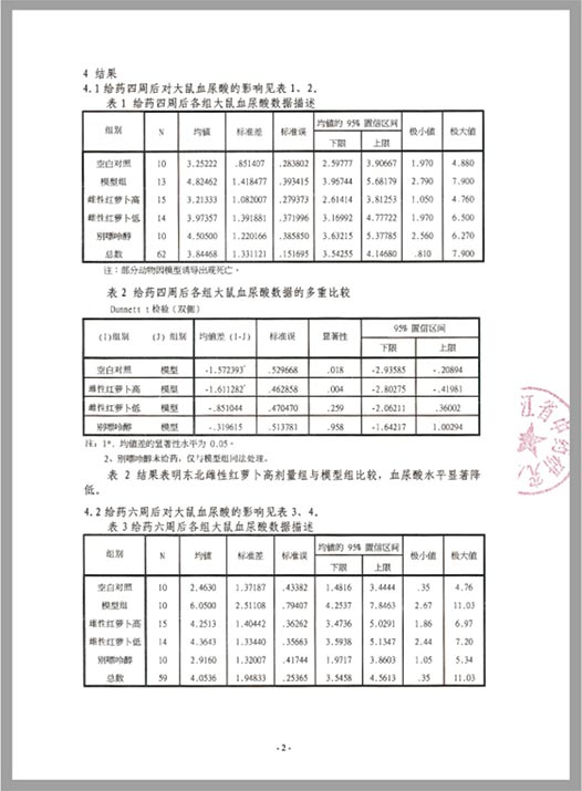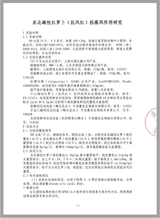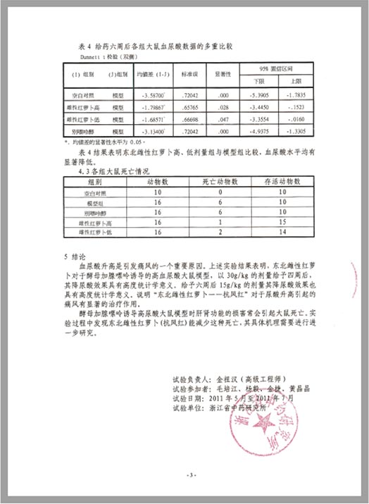 結(jié)論:血尿酸升高是引發(fā)痛風(fēng)的一個(gè)重要原因。實(shí)驗(yàn)結(jié)果表明,東北雌性紅蘿卜對于酵母加腺嘌呤誘導(dǎo)的高血尿酸大鼠模型,以30g/kg的劑量給予四周后,其降尿酸效果具有高度統(tǒng)計(jì)學(xué)意義。說明“抗風(fēng)紅·東北雌性紅蘿卜”對于尿酸升高引起的痛風(fēng)具有顯著的作用。