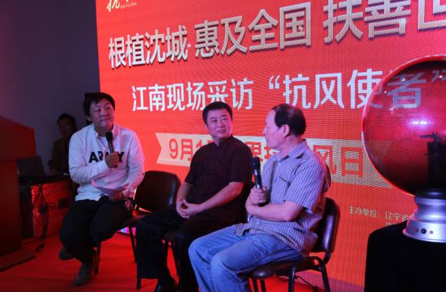 主持人江南(左)采訪抗風使者張芮袀先生(中)