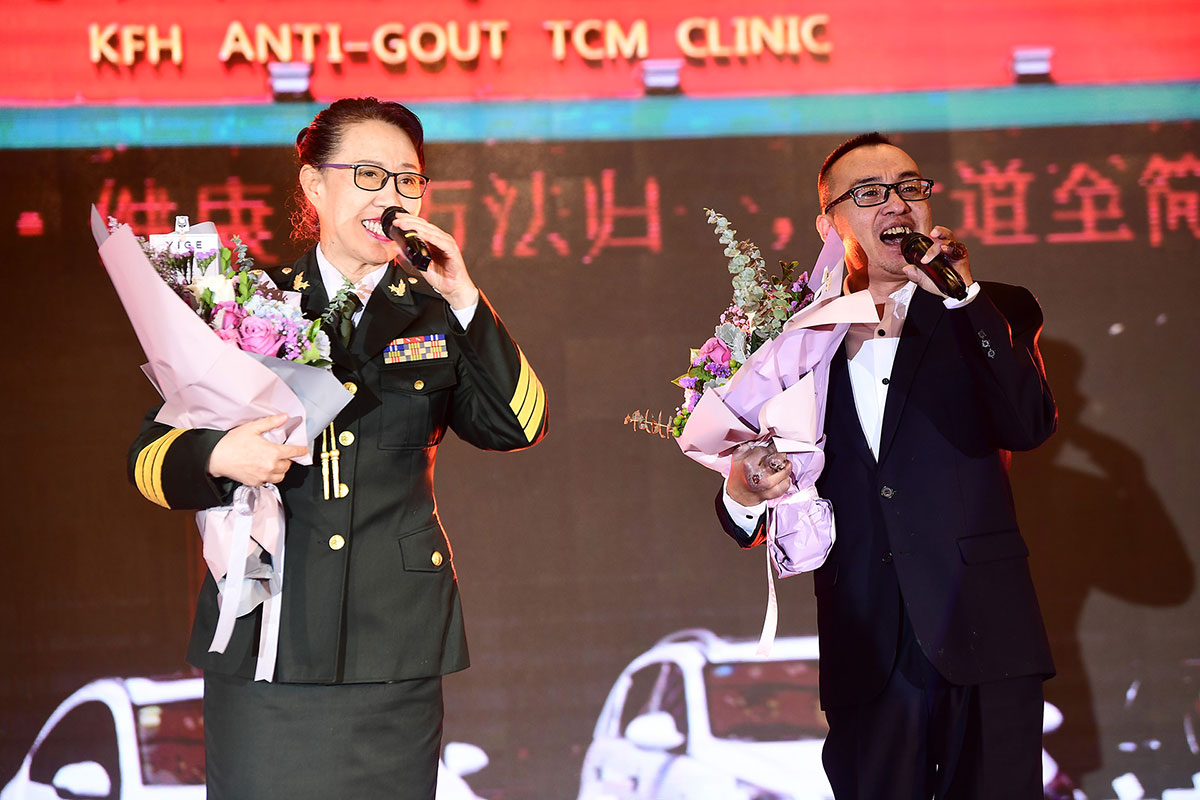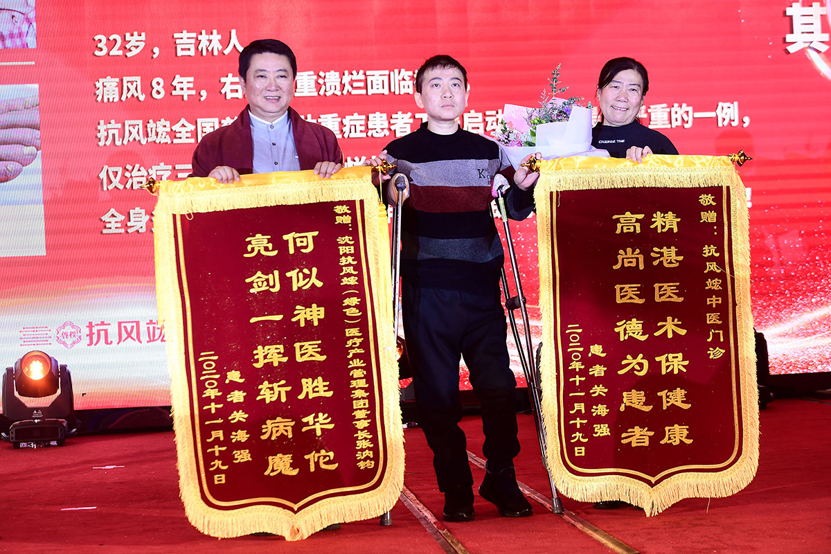慶典現(xiàn)場(chǎng)最感人的一幕要數(shù)兩位“抗風(fēng)斗士”葛晟杰和關(guān)海強(qiáng)登臺(tái)分享一路與痛風(fēng)抗?fàn)幍男穆窔v程。他們都是風(fēng)華正茂,卻備受痛風(fēng)折磨,在遇到抗風(fēng)竤之前,幾乎都瀕臨絕望。來自山東的25歲葛晟杰,痛風(fēng)七年、癱瘓三年,經(jīng)過在抗風(fēng)竤門診的系統(tǒng)治療后,丟掉輪椅和雙拐,自己走上了舞臺(tái);關(guān)海強(qiáng)更是在被多家三甲醫(yī)院診斷“不截肢就有生命危險(xiǎn)”,并且還面臨著多臟器衰竭的風(fēng)險(xiǎn),抗風(fēng)竤醫(yī)療集團(tuán)張汭鈞董事長冒著極大的風(fēng)險(xiǎn),向他伸出救助之手。如今的關(guān)海強(qiáng)不僅恢復(fù)了生命活力,而且還走上舞臺(tái)為大家吉他彈唱,重獲新生的他最想感激的就是張汭鈞董事長、程莉琂總裁以及全體抗風(fēng)竤人給了他重獲健康的希望!